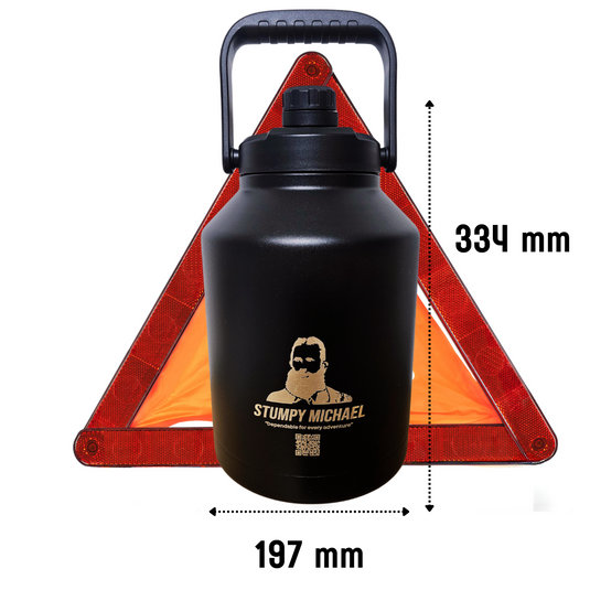 Stumpy Michael holds a whopping 6 liters—2.2L more than standard gallon-size bottles. Perfect to push a bit further on your adventures, or importantly provide extra security when things don't got to plan.